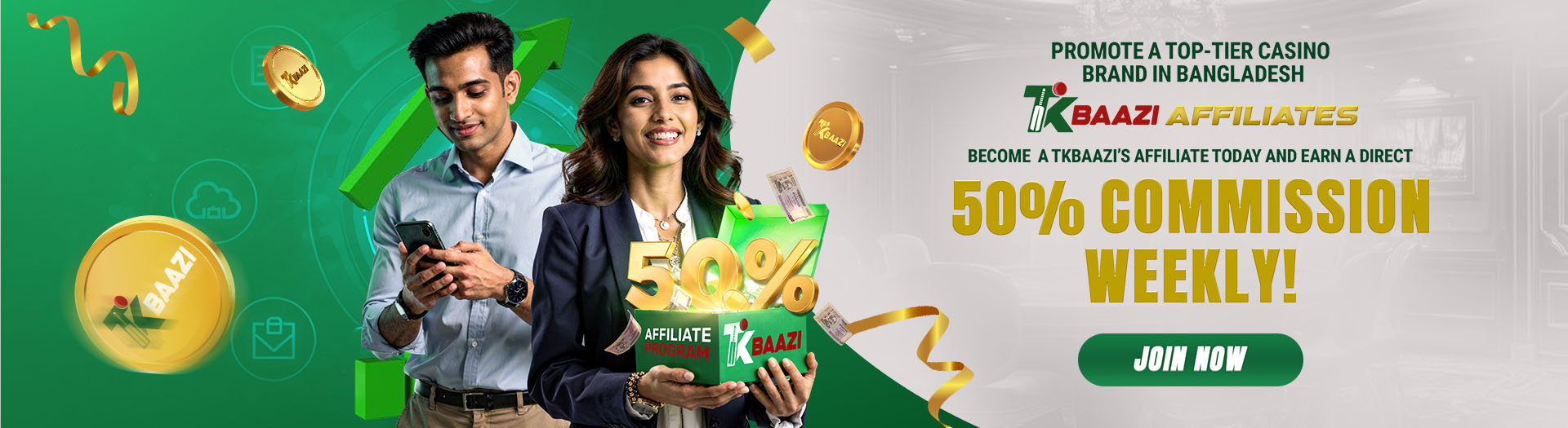 • As a TKBaazi affiliate, you can earn up to a 50% direct commission weekly from your players’ net losses.